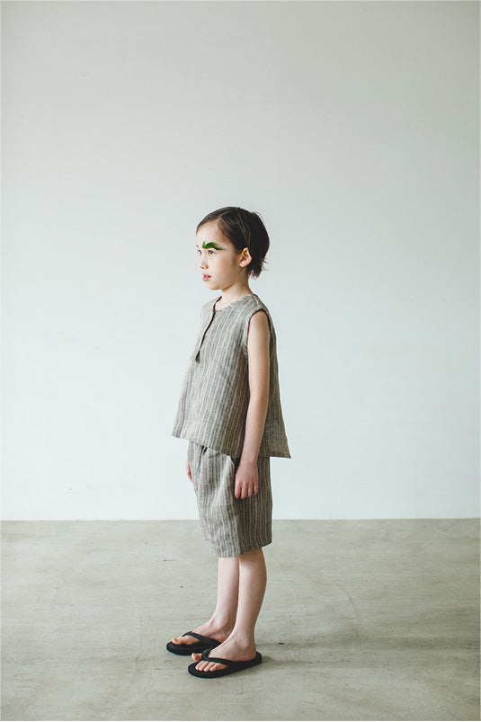 独特条纹图案的定制亚麻素材短裤。